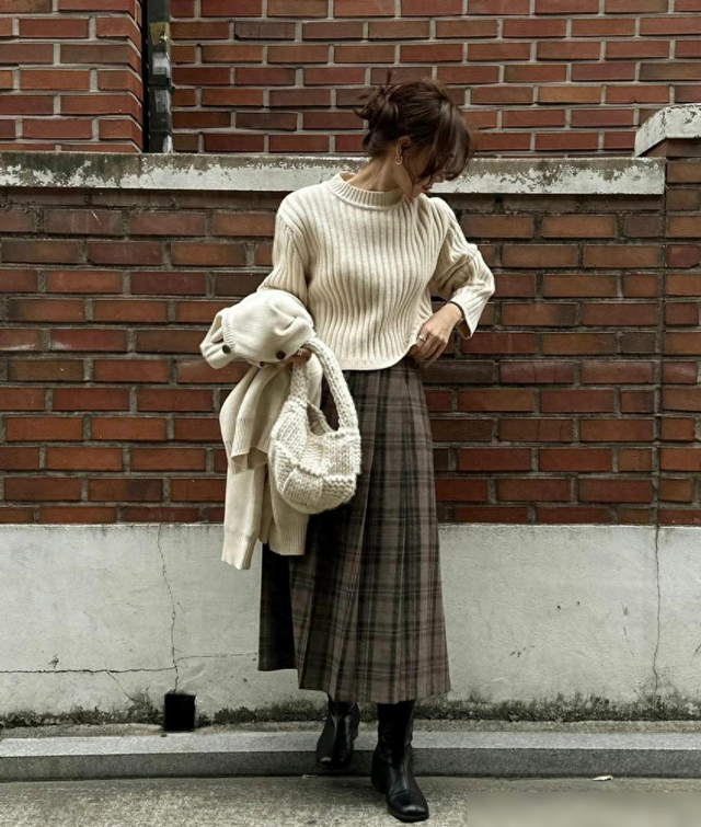 现在很多大学生在冬天穿搭的时候,都喜欢将毛衣塞进裤腰里,然后再选择一双高筒靴或者法式通透,这样不仅可以显得腿部线条纤细,还非常保暖。