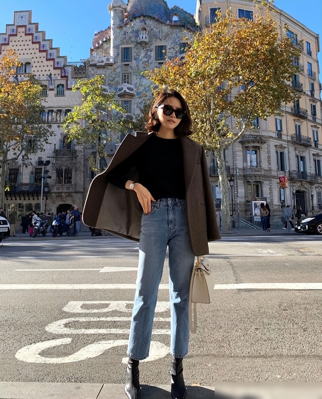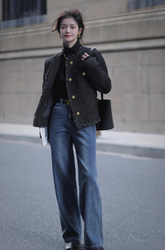 小香风外套通常是翻领和双排扣设计,有着经典而优雅的轮廓,而法式短靴则通过简约线条和经典色彩,使整体形象充满法式风情。